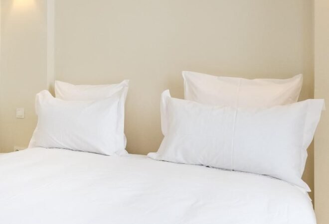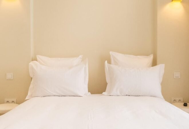 Lit double confortable de 150 x 190, avec matelas de haute qualité et oreillers moelleux
