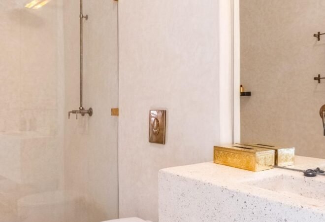 Salle de bain privée avec douche moderne et eau chaude disponible à tout moment